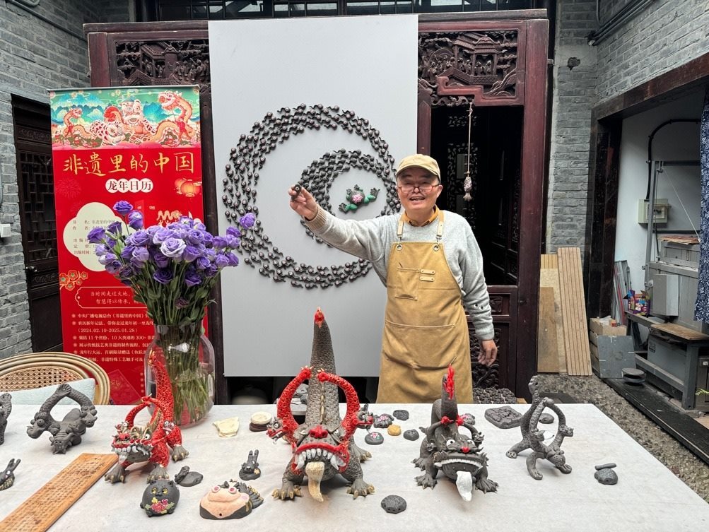 江蘇省非物質(zhì)文化遺產(chǎn)泥塑傳承人周寶康展示他的泥塑作品“太平泥叫叫”