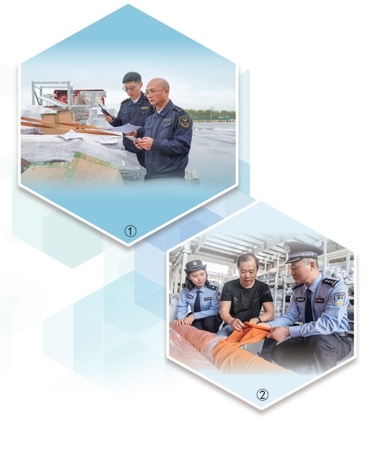 圖①:上海海關(guān)所屬松江海關(guān)工作人員檢查貨物。上海海關(guān)致力打造通關(guān)手續(xù)更簡便、通關(guān)效率更快捷、監(jiān)管更嚴(yán)密有效的營商環(huán)境。姜輝輝攝(人民視覺) 圖②:江蘇南通通州區(qū)公安局西亭派出所民警走進生產(chǎn)車間,了解企業(yè)情況,護航企業(yè)經(jīng)營發(fā)展。翟慧勇攝(人民視覺)