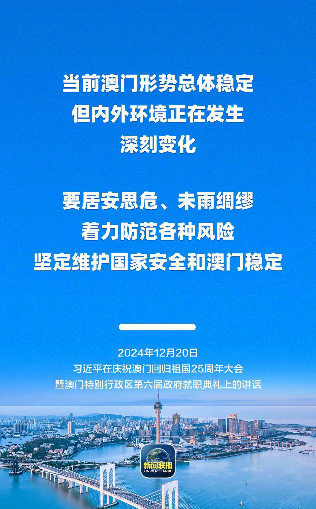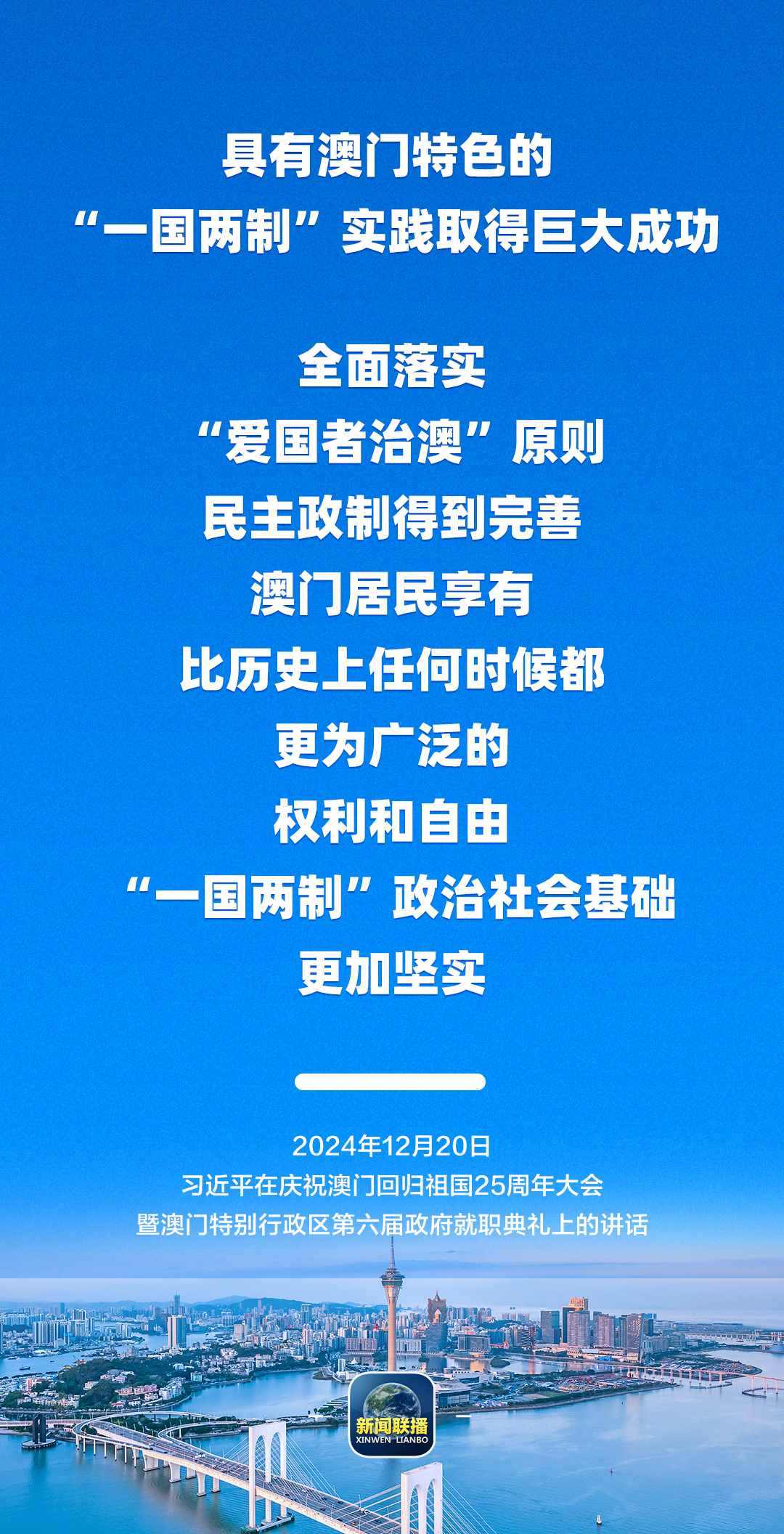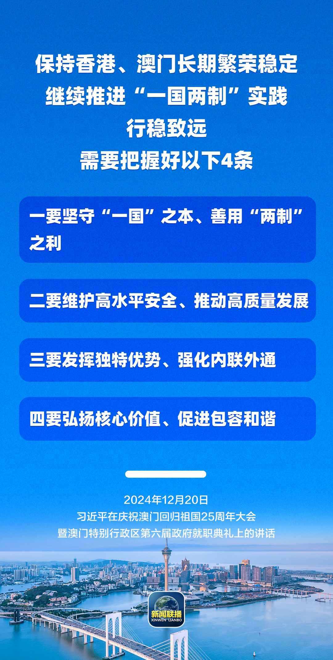 習近平強調,只要全面準確、堅定不移貫徹“一國兩制”方針,有特別行政區(qū)政府和社會各界共同努力,有偉大祖國作堅強后盾,澳門一定能打開發(fā)展新天地、不斷創(chuàng)造新輝煌,一定能為以中國式現(xiàn)代化全面推進強國建設、民族復興偉業(yè)作出更大貢獻。