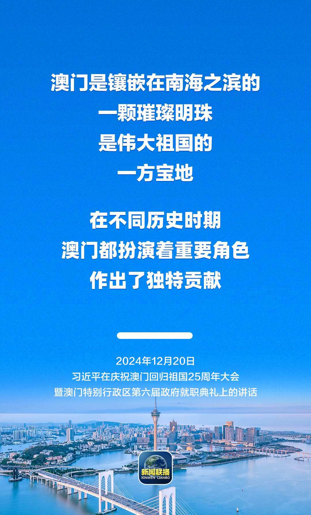 12月20日上午,慶祝澳門回歸祖國25周年大會暨澳門特別行政區(qū)第六屆政府就職典禮舉行。中共中央總書記、國家主席、中央軍委主席習近平出席并發(fā)表重要講話。