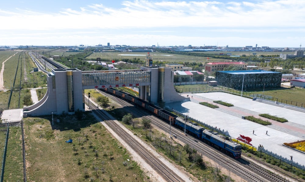 2024年9月11日,列車駛出內(nèi)蒙古二連浩特鐵路口岸(無人機照片)。二連浩特口岸是中國對蒙古國開放的最大陸路口岸,也是中歐班列“中通道”唯一進出境口岸。二連浩特鐵路口岸出入境中歐班列運載貨物種類豐富,涵蓋輕紡產(chǎn)品、電子電器、機器配件、國產(chǎn)汽車、日用品等。