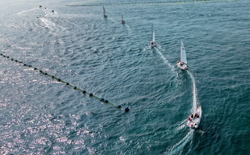 青島小麥島附近海域,市民和游客乘坐帆船參加海上巡游活動(7月10日攝,無人機照片)。