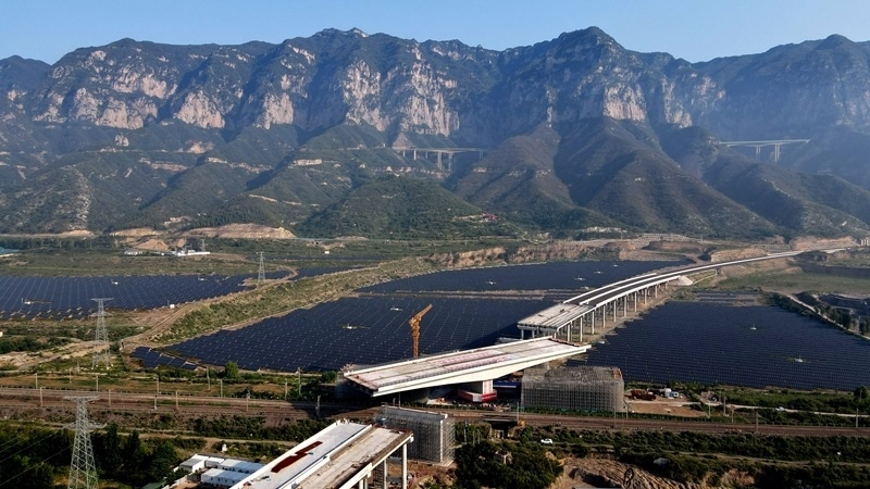 這是8月11日拍攝的河南省濟(jì)源市沿太行山高速公路跨焦柳鐵路立交橋轉(zhuǎn)體施工現(xiàn)場(chǎng)(無(wú)人機(jī)照片)。