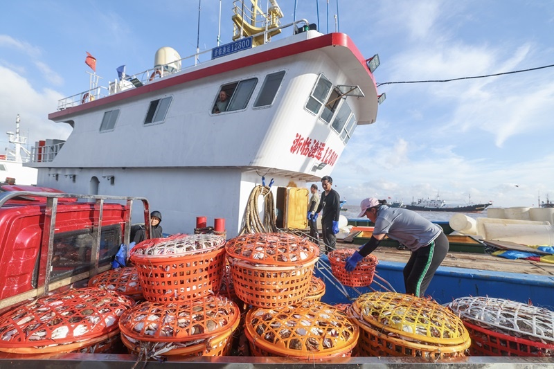 8月12日,開漁歸來(lái)的漁運(yùn)船靠泊在舟山沈家門舟山國(guó)際水產(chǎn)城碼頭,漁民把整筐的梭子蟹運(yùn)送上岸裝車。