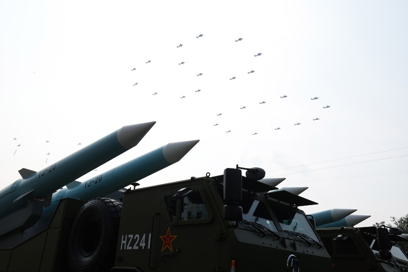 9月3日,紀念中國人民抗日戰(zhàn)爭暨世界反法西斯戰(zhàn)爭勝利80周年大會在北京隆重舉行。這是空中護旗梯隊從反艦導彈方隊上空飛過。