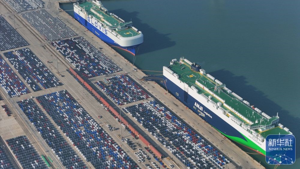 ↑ 12月14日在江蘇省港口集團(tuán)南京港龍?zhí)都b箱碼頭拍攝的等待裝船出口的國產(chǎn)汽車(無人機(jī)照片)。新華社發(fā)(楊素平攝)