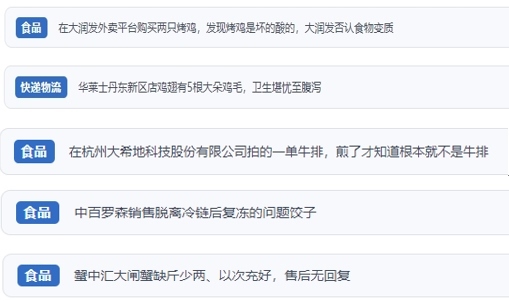 “人民投訴”上不少網(wǎng)友反映,“外賣商家銷售排骨套餐中含過(guò)期飲料”“外賣店鋪吃出蟑螂,商家不按照食品安全法賠償” “直播間購(gòu)買車?yán)遄樱摷傩麄?J、原裝進(jìn)口,到貨嚴(yán)重貨不對(duì)板”“網(wǎng)購(gòu)東北珍珠貢米,到貨包裝上執(zhí)行標(biāo)準(zhǔn)是廢止的標(biāo)準(zhǔn)”“超市買的梅花肉切開(kāi)發(fā)現(xiàn)是淋巴肉”“平臺(tái)商家承諾枸杞不熏硫酸,實(shí)則檢測(cè)后含硫超標(biāo)”“知名便利店售賣脫離冷鏈后多次復(fù)凍的餃子”等。