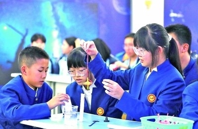 在內(nèi)蒙古阿拉善盟額濟納旗地面課堂,學生在做趣味實驗。新華社發(fā)