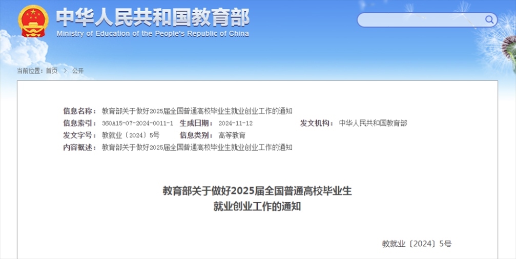 記者11月13日從教育部獲悉,教育部近日印發(fā)通知,部署做好2025屆全國普通高校畢業(yè)生就業(yè)創(chuàng)業(yè)工作。通知提出實(shí)施2025屆全國普通高校畢業(yè)生就業(yè)創(chuàng)業(yè)促進(jìn)和服務(wù)體系建設(shè)行動,全力促進(jìn)高校畢業(yè)生高質(zhì)量充分就業(yè)。