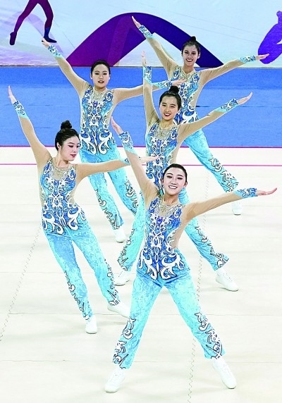 12月5日,第18屆中國大學(xué)生健美操錦標(biāo)賽在河北省遷安市舉行。圖為江西師范大學(xué)代表隊在甲組中國大學(xué)生中級校園健美操規(guī)定動作決賽中。新華社記者 楊世堯攝