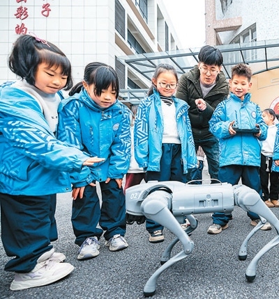 圖為孩子們與機(jī)器狗互動(dòng)。