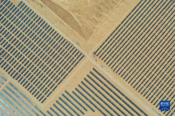 一匹占地130多萬平方米的沙漠“駿馬”橫臥在內(nèi)蒙古自治區(qū)庫布其沙漠之中,這是位于達(dá)拉特光伏發(fā)電應(yīng)用領(lǐng)跑基地中、由近20萬塊光伏板組成的“駿馬電站”。該電站采用“林光互補(bǔ)”模式,板上發(fā)電、板下種植,在開發(fā)利用庫布其沙漠豐富太陽能資源的同時(shí),推動沙漠生態(tài)治理。