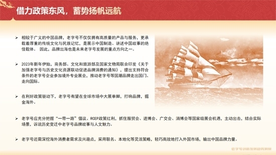 《報告》提到,在利好政策驅(qū)動下,老字號有望在全球市場中大展拳腳,打響品牌,掘金海外。具體來看,老字號應(yīng)充分把握“一帶一路”倡議、RCEP政策紅利,抓住國家級展會機遇,主動出擊,結(jié)合實際場景,訴說歷史變遷中老字號品牌故事與人文魅力。
