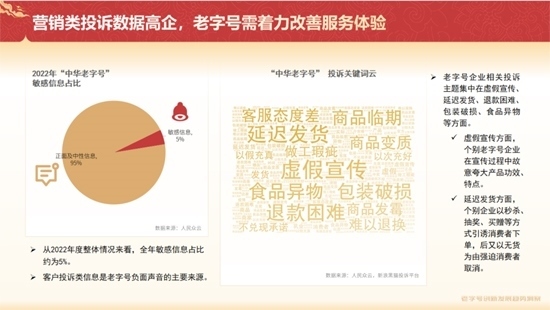 《報告》同時指出,在消費者側(cè),客戶投訴類信息是老字號負面聲音的主要來源,老字號企業(yè)相關(guān)投訴主題集中在虛假宣傳、延遲發(fā)貨、退款困難、包裝破損、食品異物等方面。這些問題不僅影響了消費者體驗,也不利于企業(yè)自身保持優(yōu)質(zhì)的聲譽形象。