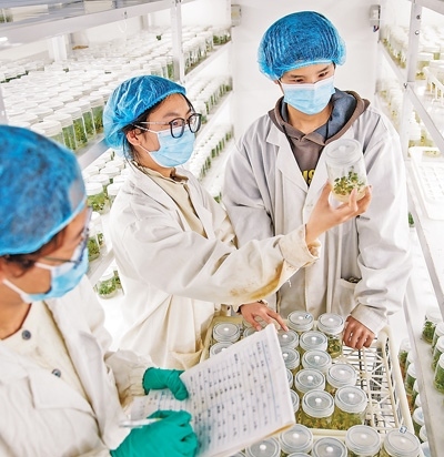 河南商丘睢縣城關(guān)鎮(zhèn)袁莊村,工作人員在實(shí)驗(yàn)室內(nèi)查看草莓組培苗生長(zhǎng)情況。