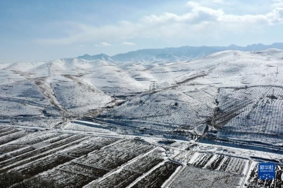 2月14日拍攝的烏鞘嶺及周邊雪景(無人機照片)。