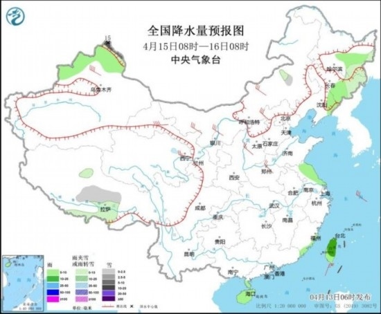 4月15日08時至16日08時,黑龍江東南部、吉林東部、新疆北疆北部、西藏南部等地部分地區(qū)有小到中雪或雨夾雪,其中,新疆北疆北部局地有大到暴雪(10~15毫米)。黑龍江東部、吉林東部、遼寧東部、新疆北部、江淮東部、海南島、臺灣島等地部分地區(qū)有小雨,其中,臺灣島部分地區(qū)有中雨。內(nèi)蒙古中西部、西北地區(qū)中東部、華北大部等地部分地區(qū)有4~6級風(fēng),其中,新疆沿天山地區(qū)、甘肅河西等地部分地區(qū)有6~7級風(fēng)。東海北部海域?qū)⒂?~7級、陣風(fēng)8級的西北風(fēng),臺灣以東洋面將有5~7級、陣風(fēng)8級的東北風(fēng)。