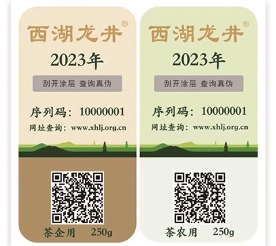 “專用標(biāo)識(shí)分為‘證明標(biāo)N(茶農(nóng)用)’和‘證明標(biāo)Q(企業(yè)用)’兩種樣式,相當(dāng)于西湖龍井茶的一張‘身份證’,上面包含了使用主體、年份、規(guī)格、編號(hào)、防偽信息等內(nèi)容?!本皡^(qū)執(zhí)法隊(duì)提醒,龍井茶大量上市時(shí)期,購(gòu)買正宗西湖龍井需認(rèn)準(zhǔn)專用標(biāo)識(shí)。