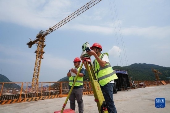 5月4日,在重慶市北碚區(qū)渝武高速復(fù)線觀音峽嘉陵江特大橋,中交一公局四公司橋梁工區(qū)工作人員孫培耕(左)和彭昭屏在對橋面高程及軸線偏位進(jìn)行測量。