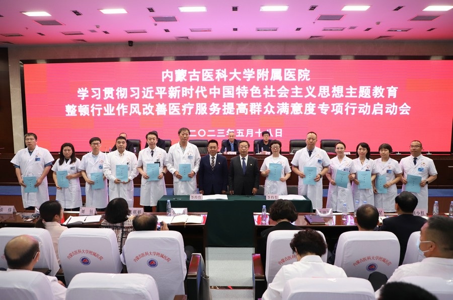 啟動會上,內(nèi)蒙古醫(yī)科大學黨委委員、附屬醫(yī)院黨委書記張立東,醫(yī)院黨委委員、紀委書記劉玉龍與專項行動工作小組組長簽訂責任狀,并為10名社會監(jiān)督員頒發(fā)聘書。