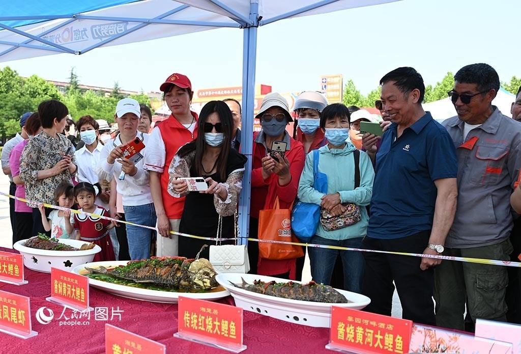 5月17日,“中國旅游日”主題周活動期間,河南省義馬市舉辦“櫻紅五月”美食節(jié),集中展示當?shù)氐奶厣朗?、名?yōu)特產(chǎn),為了讓游客有更好的體驗,當?shù)?2家飯店還進行了精彩紛呈的廚藝大比拼?;顒蝇F(xiàn)場,游客在圍觀經(jīng)典豫菜“紅燒黃河大鯉魚”。人民網(wǎng)記者 王玉興攝