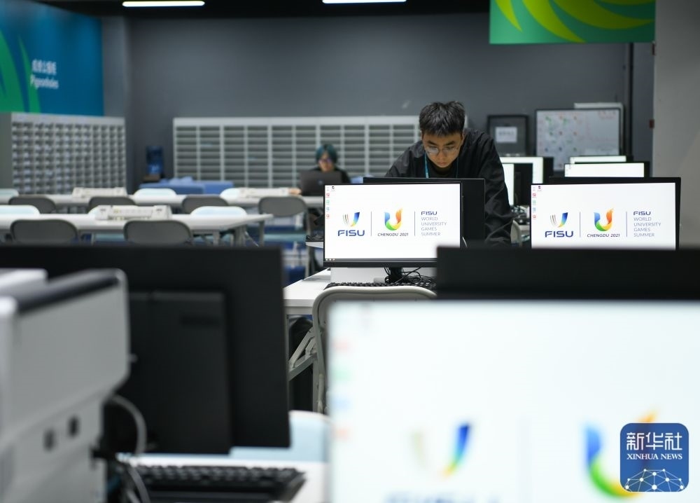 ↑7月13日,在成都大運(yùn)會主媒體中心,工作人員正在調(diào)試媒體工作間的電腦。新華社記者 王曦 攝