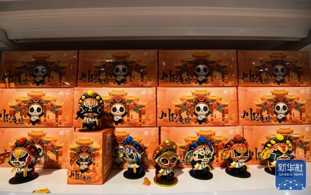 ↑這是7月13日拍攝的成都大運(yùn)會主媒體中心大運(yùn)會官方特許商品零售店展出的“蓉寶”川劇變臉造型玩偶。新華社記者 王曦 攝