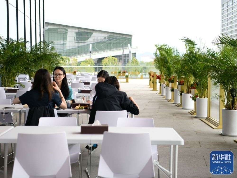 ↑7月14日,工作人員在成都大運(yùn)會主媒體中心媒體餐廳室外就餐區(qū)就餐。新華社記者 胥冰潔 攝
