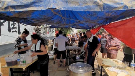 在涿州市刁窩鎮(zhèn)西茨村臨時(shí)飯點(diǎn),村民們排隊(duì)領(lǐng)取飯菜。新華社記者蘇凱洋 攝