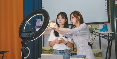 沈珺(右)在指導(dǎo)學(xué)生進(jìn)行直播營(yíng)銷。汪玉瑩攝