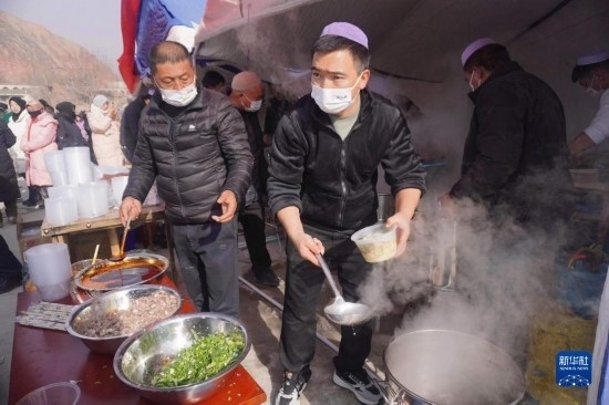 12月19日,在甘肅臨夏積石山縣大河家鎮(zhèn)大河村安置點(diǎn),蘭州餐飲企業(yè)“筷上癮”為受災(zāi)群眾送來(lái)愛心牛肉面。