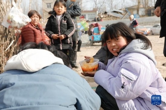 12月19日,在甘肅臨夏積石山縣大河家鎮(zhèn)大河村安置點(diǎn),小朋友在吃愛心牛肉面。