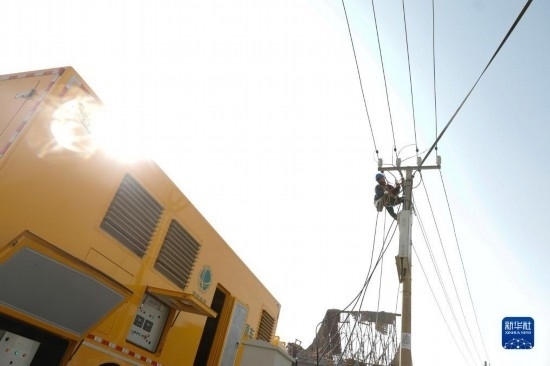 12月19日,在甘肅臨夏積石山縣大河家鎮(zhèn)大河村安置點(diǎn),電力部門工作人員搶修電力設(shè)施。