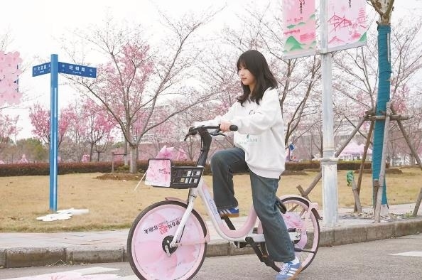 櫻花節(jié)期間,學(xué)校是禁止機(jī)動車入校的。校園大,游人累了怎么辦?上經(jīng)貿(mào)大學(xué)生食堂門口便出現(xiàn)了一道亮麗的風(fēng)景線:那就是學(xué)校和“哈啰單車”聯(lián)名的粉色共享單車。50輛粉色的單車整齊排放在廣場上,車頭的粉色風(fēng)車迎風(fēng)轉(zhuǎn)動,櫻花節(jié)專屬IP“貿(mào)小櫻”人偶,揮舞著雙手邀請師生們前來騎行。聯(lián)名活動設(shè)計(jì)了賞櫻打卡點(diǎn),游客可以騎著櫻花單車游覽校園,在3個最佳賞櫻點(diǎn)拍照打卡,體驗(yàn)各處櫻花的詩情畫意。
