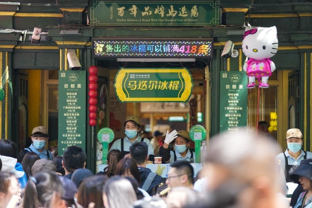 5月1日,在哈爾濱中央大街上,馬迭爾冰棍的銷售人員在招攬顧客。新華社記者 王建威 攝