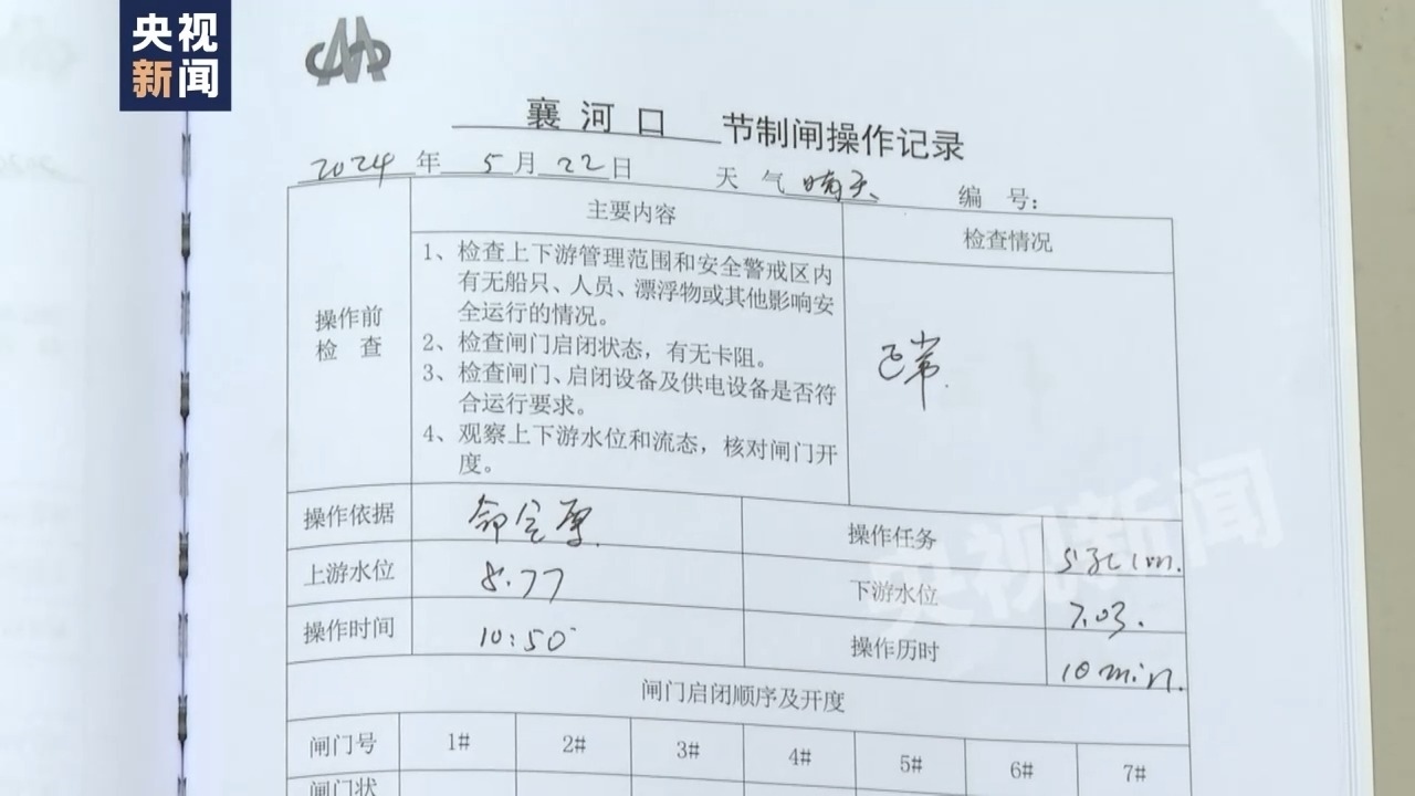 記者在安徽省駟馬山引江工程襄河口閘管理所的節(jié)制閘操作記錄本上看見,發(fā)現(xiàn)在5月18日上午,這里的節(jié)制閘原本已處于完全關(guān)閉狀態(tài)。然而在發(fā)現(xiàn)水體污染的兩天后,5月22日上午10點(diǎn)50分,襄河口七孔節(jié)制閘中的五孔開閘,在閘前聚集兩天的污水一路暢通地進(jìn)入滁河。這一次放水直至5月23日15點(diǎn)50分結(jié)束,時(shí)間長(zhǎng)達(dá)29個(gè)小時(shí)。