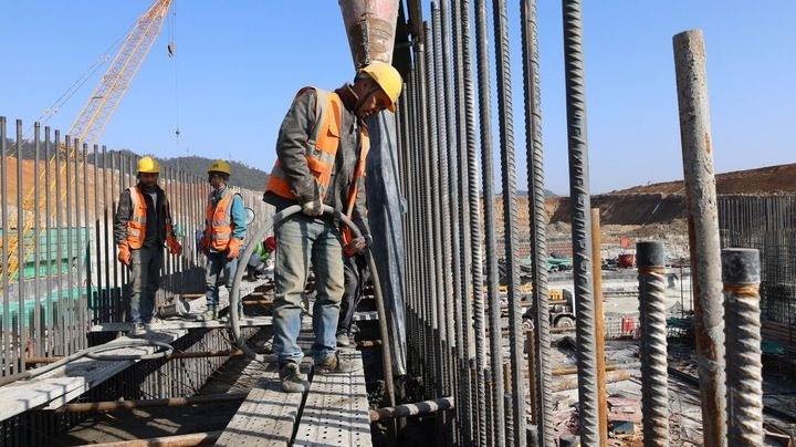 1月28日,工人在江西省景德鎮(zhèn)市樂平水利樞紐工程建設(shè)現(xiàn)場施工。新華社發(fā)(賀蔚安 攝)