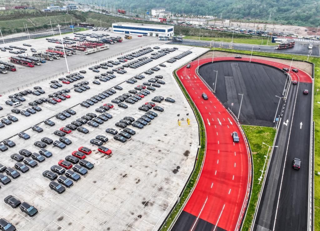 2024年11月6日在位于重慶市兩江新區(qū)的賽力斯超級(jí)工廠拍攝的新能源汽車(無人機(jī)照片)。新華社記者 王全超 攝