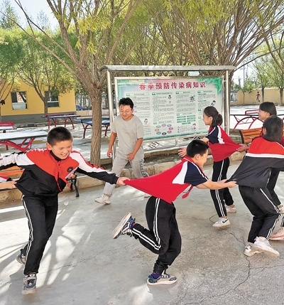 閆澤峰在和學(xué)生們做游戲。