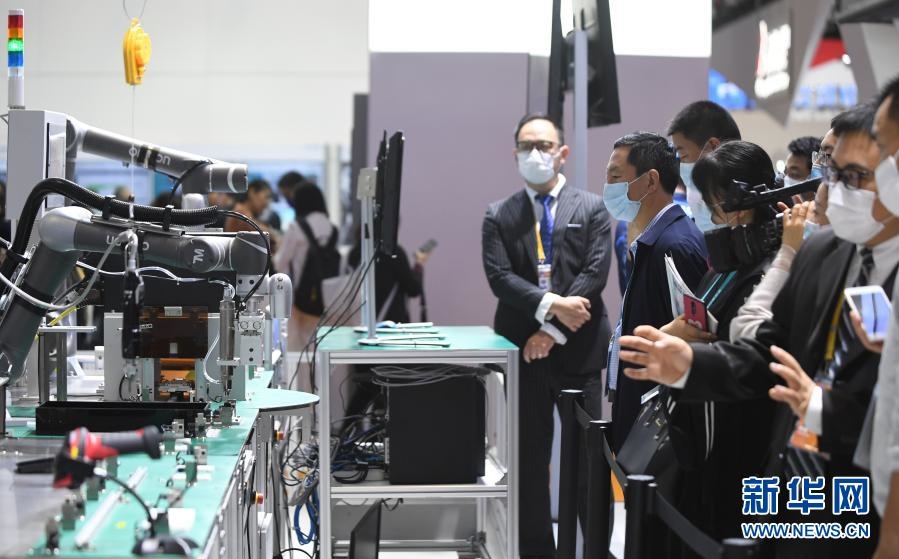 2020年11月6日,在進(jìn)博會技術(shù)裝備展區(qū),人們在西門子展臺觀看人機(jī)協(xié)作的智能化單元生產(chǎn)線。新華社記者 李任滋 攝