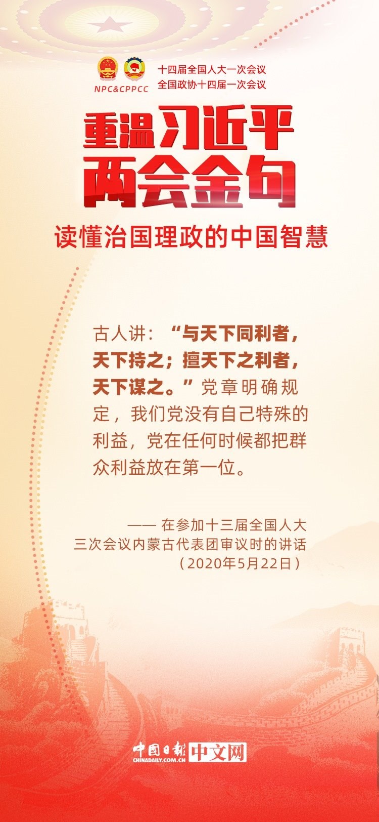 黨的十八大以來(lái),每年兩會(huì)期間,習(xí)近平總書(shū)記都要與代表委員共商國(guó)是。十年來(lái),在一系列重要論述中,習(xí)近平總書(shū)記使用詩(shī)詞、古語(yǔ)等典故,把中華優(yōu)秀傳統(tǒng)文化融入治國(guó)理政的理論和實(shí)踐中。