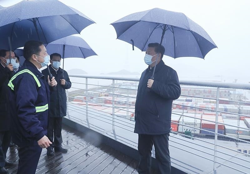 △2020年3月29日,習(xí)近平總書(shū)記在浙江寧波舟山港考察調(diào)研??疾旆稻┎蛔?0天,總書(shū)記在中央財(cái)經(jīng)委員會(huì)第七次會(huì)議上,首次提出構(gòu)建新發(fā)展格局。