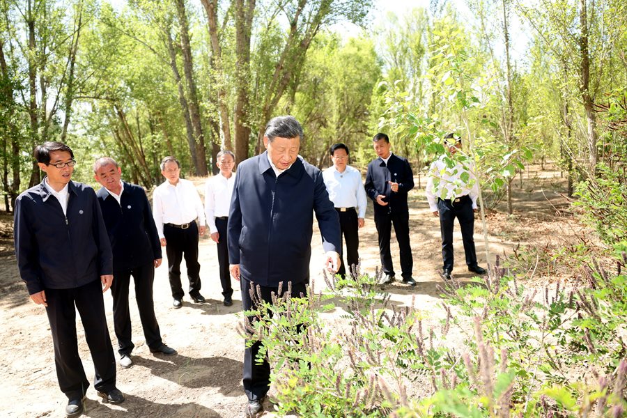 2023年6月5日至6日,中共中央總書記、國(guó)家主席、中央軍委主席習(xí)近平在內(nèi)蒙古巴彥淖爾考察,并主持召開加強(qiáng)荒漠化綜合防治和推進(jìn)“三北”等重點(diǎn)生態(tài)工程建設(shè)座談會(huì)。這是6日上午,習(xí)近平在臨河區(qū)國(guó)營(yíng)新華林場(chǎng)考察。新華社記者