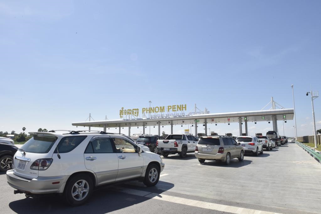 2022年11月7日,車輛在柬埔寨首都金邊的金港高速公路入口處排隊(duì)。金港高速公路連接柬埔寨首都金邊和該國(guó)最大深水海港西哈努克港。