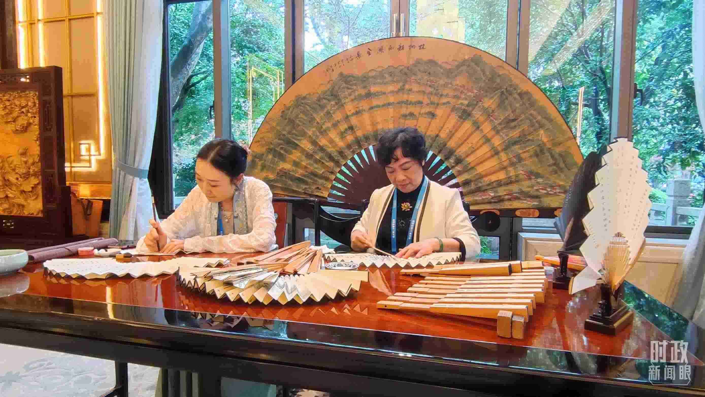 宴會廳外,東陽木雕、杭州刺繡、王星記扇等浙江非物質文化遺產(chǎn)展示,吸引貴賓們流連駐足。