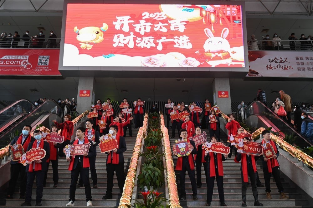 商戶代表在義烏國(guó)際商貿(mào)城的大廳進(jìn)行文藝表演(2023年2月2日攝)。新華社記者 黃宗治 攝