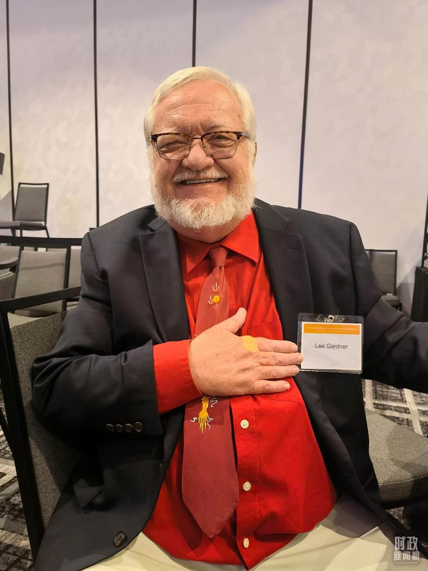 年逾70歲的李·加德納,是“鼓嶺故事”主人公密爾頓·加德納的侄孫。當(dāng)天他特意佩戴了一條繡有“中國(guó)龍”的領(lǐng)帶。(總臺(tái)央視記者石丞、國(guó)廣記者李晉拍攝)