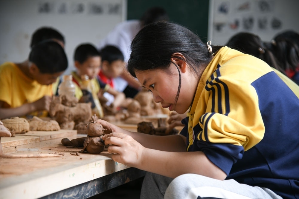5月31日,學(xué)生在陶藝課上制作陶藝品。