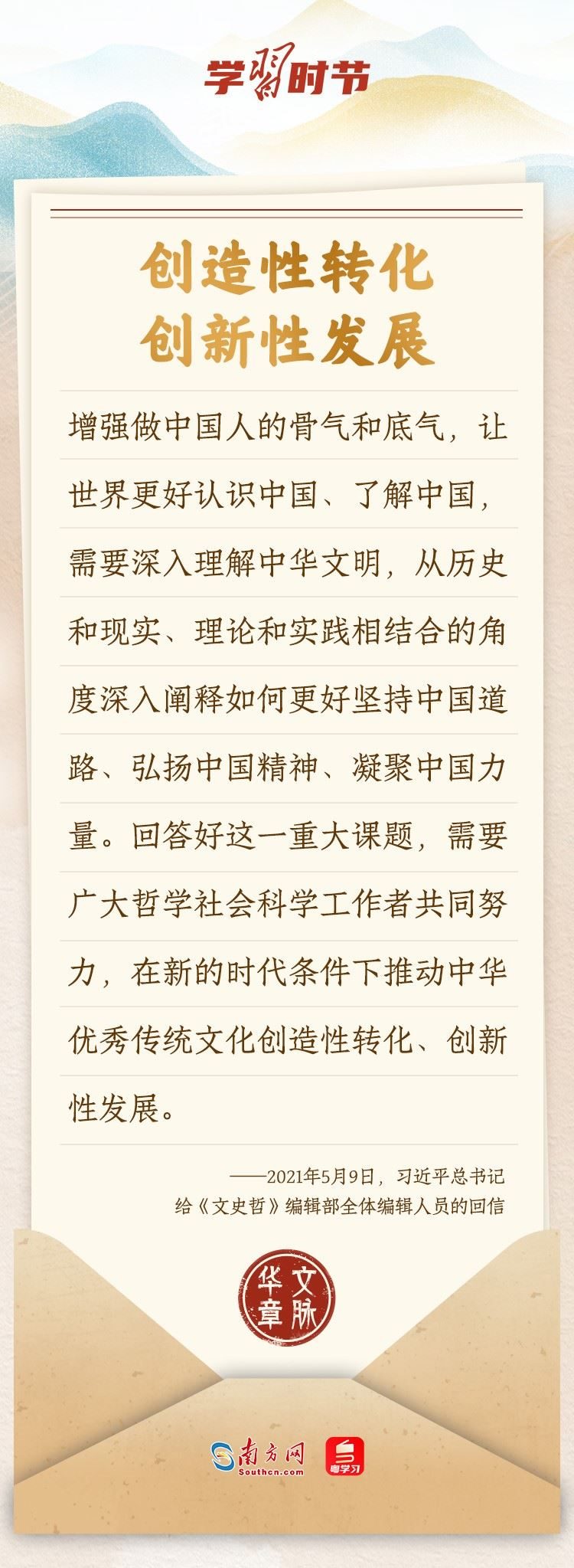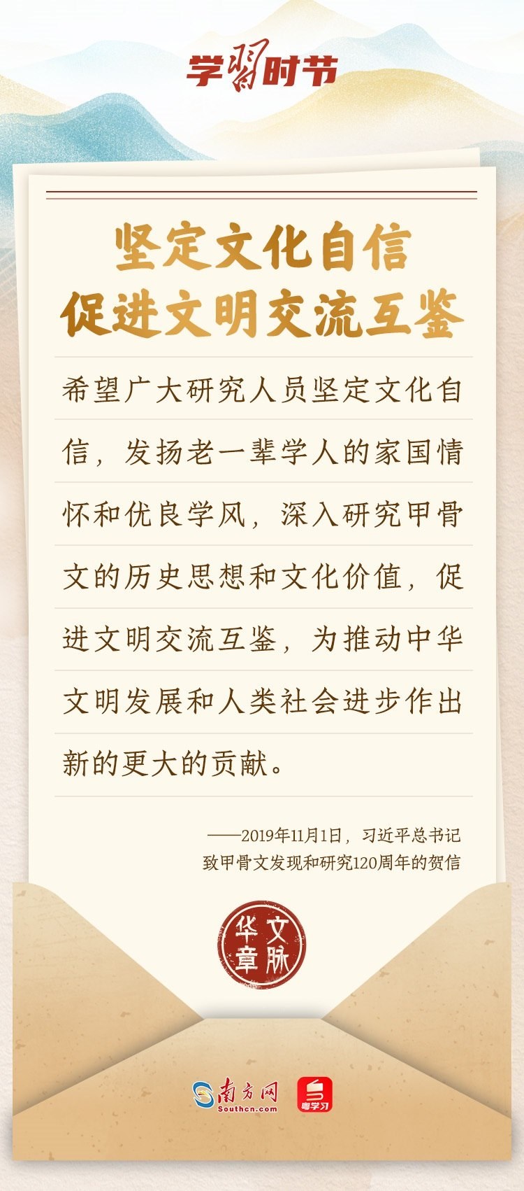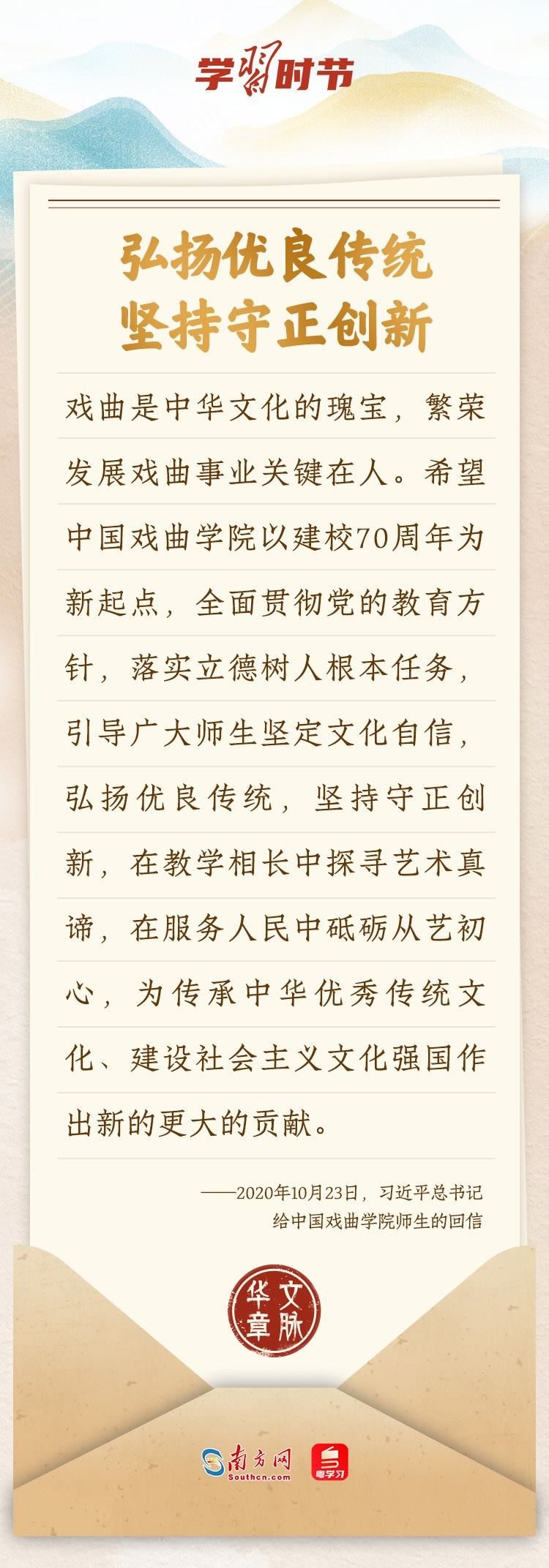 “中華民族在幾千年歷史中創(chuàng)造和延續(xù)的中華優(yōu)秀傳統(tǒng)文化,是中華民族的根和魂。”習(xí)近平總書記多次通過發(fā)賀信、寫回信等方式,表達(dá)著對(duì)弘揚(yáng)中華優(yōu)秀傳統(tǒng)文化的殷切希望,飽含深情、字字暖心、催人奮進(jìn)。讓我們一起“讀”信。