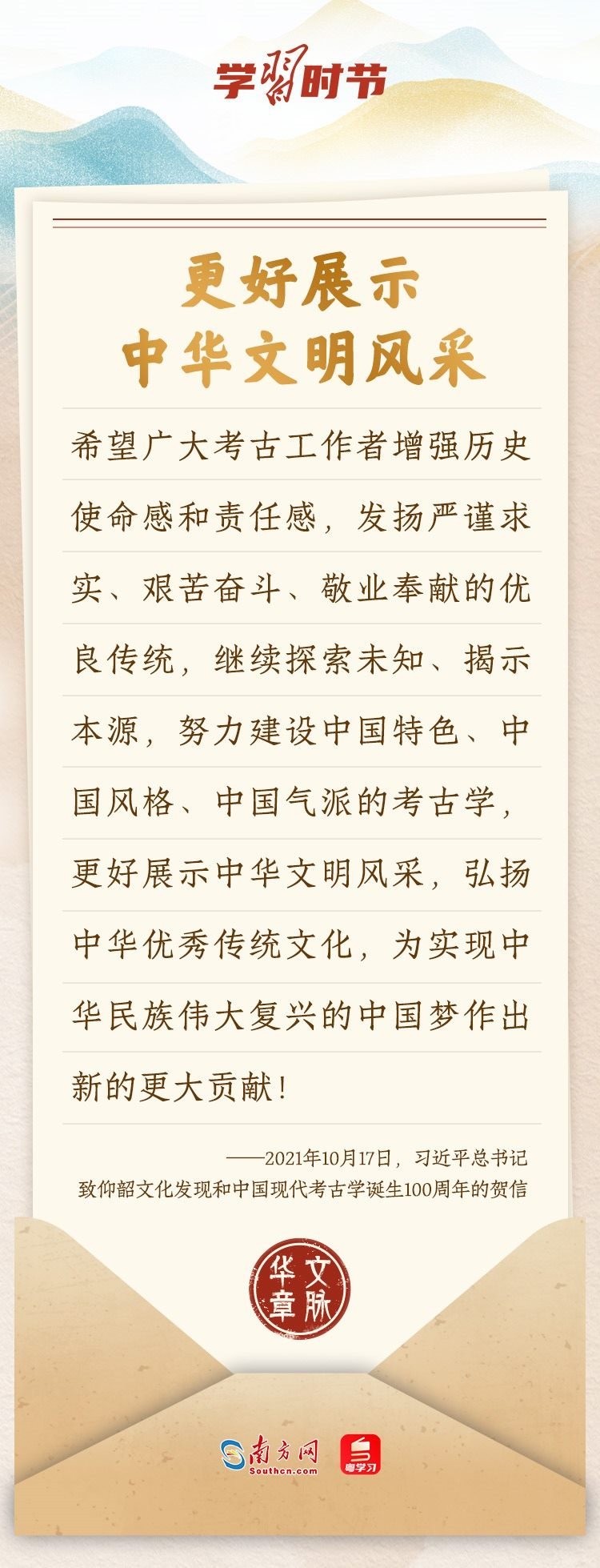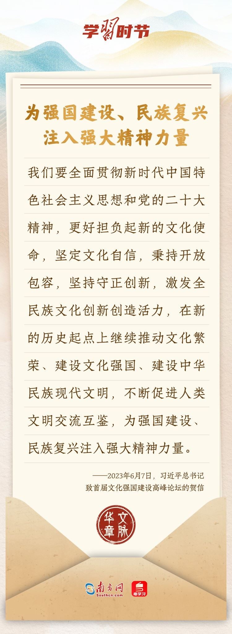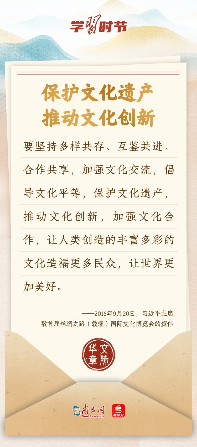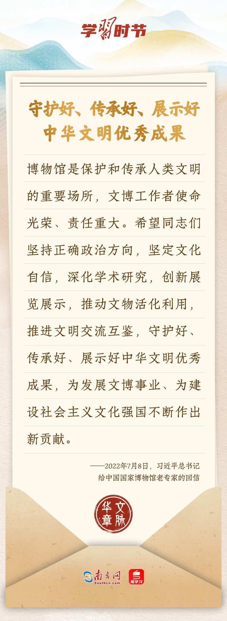 “中華民族在幾千年歷史中創(chuàng)造和延續(xù)的中華優(yōu)秀傳統(tǒng)文化,是中華民族的根和魂。”習(xí)近平總書記多次通過發(fā)賀信、寫回信等方式,表達(dá)著對(duì)弘揚(yáng)中華優(yōu)秀傳統(tǒng)文化的殷切希望,飽含深情、字字暖心、催人奮進(jìn)。讓我們一起“讀”信。